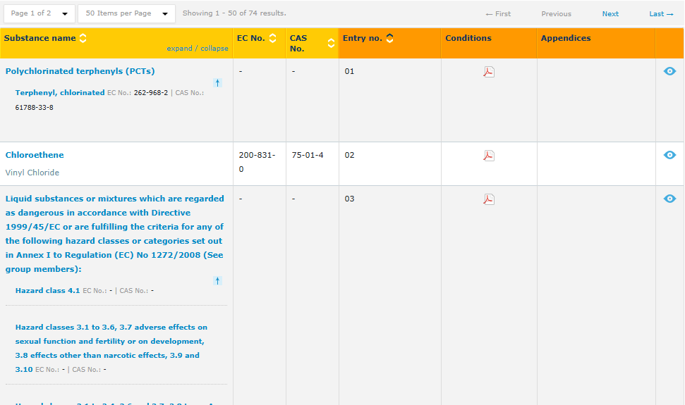 The European Chemicals Agency is the central body responsible for implementing REACH. The agency also maintains publicly accessible databases containing information on registered substances, including their hazards and safe usage guidelines. These databases, or lists, categorize substances based on their assessment and regulatory status. Such a list looks like this:
